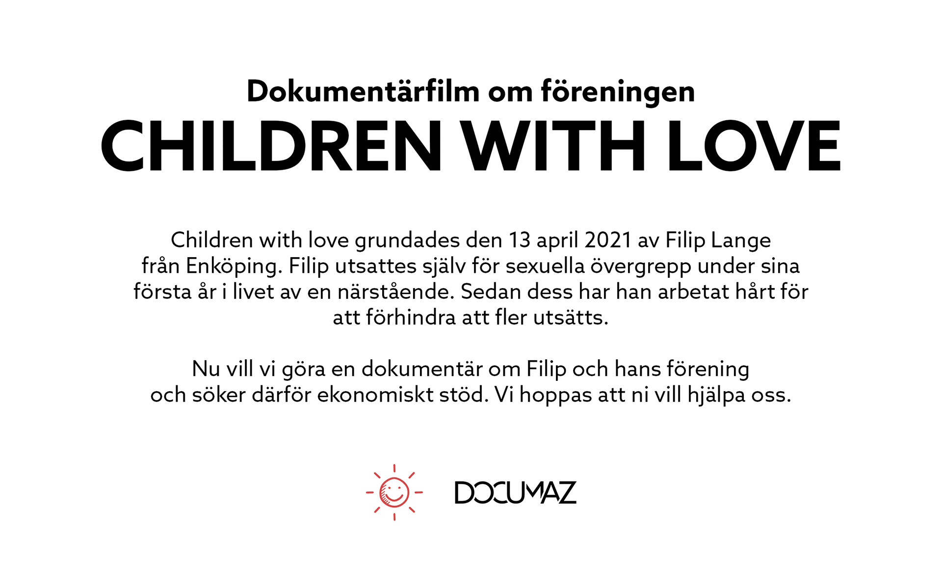 Children with Love grundades den 13 april 2021 av Filip Lange från Enköping. Filip utsattes själv för sexuella övergrepp under sina första år i livet av en närstående. Sedan dess har han arbetat hårt för att förhindra att fler utsätts. Nu vill de göra en dokumentärfilm om Filip själv, arbetet bakom och framöver. Filip tar studenten i år och tanken är att jag ska följa honom fram tills dess.